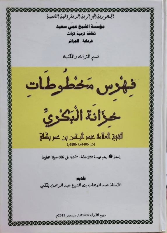 فهرس مخطوطات خزانة البكري للشيخ العلامة عبد الرحمن بن عمر بكلي (ت: 1406هـ/ 1986م) - فهرس مخطوطات خزانتيْ الشيخين: بَنوح بن أحمد مَصباح (ت.1427هـ/ 2006م)/ صالح بن حَمُّو بابُهونْ (ت.1384هـ/ 1964م)